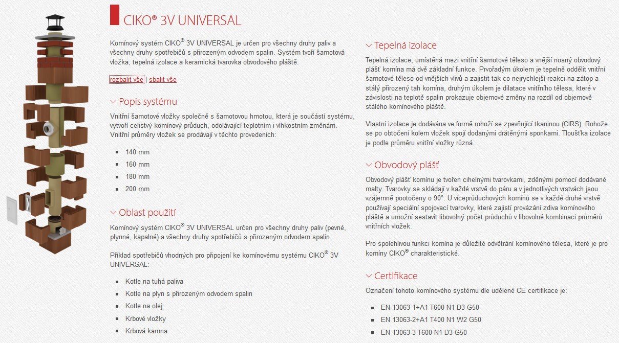 Cihelný komínový systém CIKO 3V UNIVERSAL je třísložkový systém, skládající se ze šamotových vložek, tepelné izolace a cihelných tvarovek tvořících komínový plášť. Systém CIKO 3V UNIVERSAL je vhodný pro všechny druhy paliv a pro všechny typy spotřebičů s přirozeným odvodem spalin. Tento komínový systém se používá například pro kotle na tuhá, plynná i kapalná paliva, krbové vložky, krbová kamna atd.