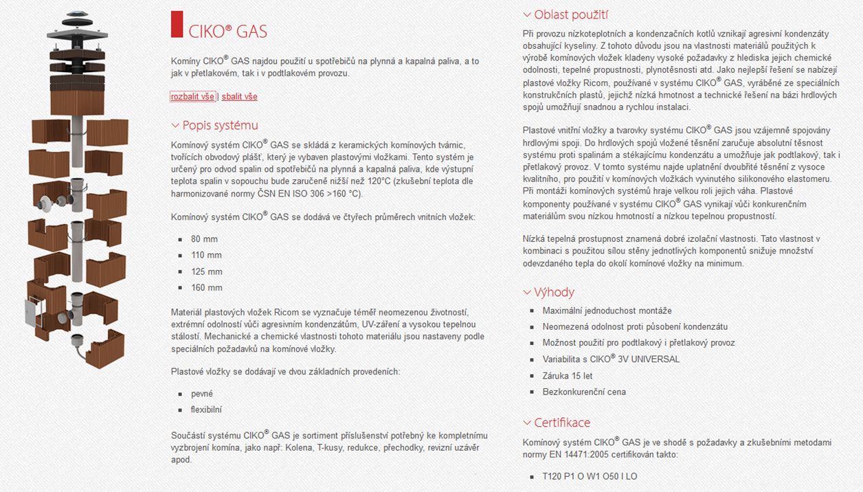 Dvousložkový systém CIKO GAS se skládá ze speciálních plastových vložek a broušených cihelných tvarovek, tvořících obvodový plášť. Tento systém je určený pro odvod spalin od spotřebičů na plynná paliva, kde výstupní teplota spalin v hrdle spotřebiče nepřekročí 120 °C. Nejčastěji se systém CIKO GAS používá pro odkouření kondenzačních plynových kotlů.