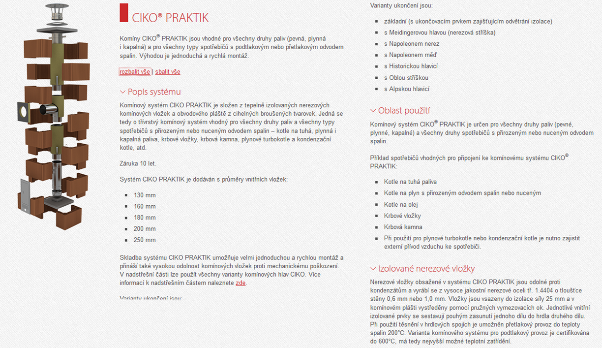 Komínový systém CIKO PRAKTIK je složen z tepelně izolovaných nerezových komínových vložek a obvodového pláště z cihelných broušených tvarovek. Jedná se tedy o třívrstvý komínový systém vhodný pro všechny druhy paliv a všechny typy spotřebičů s přirozeným nebo nuceným odvodem spalin – kotle na tuhá, plynná i kapalná paliva, krbové vložky, krbová kamna, plynové turbokotle a kondenzační kotle, atd.