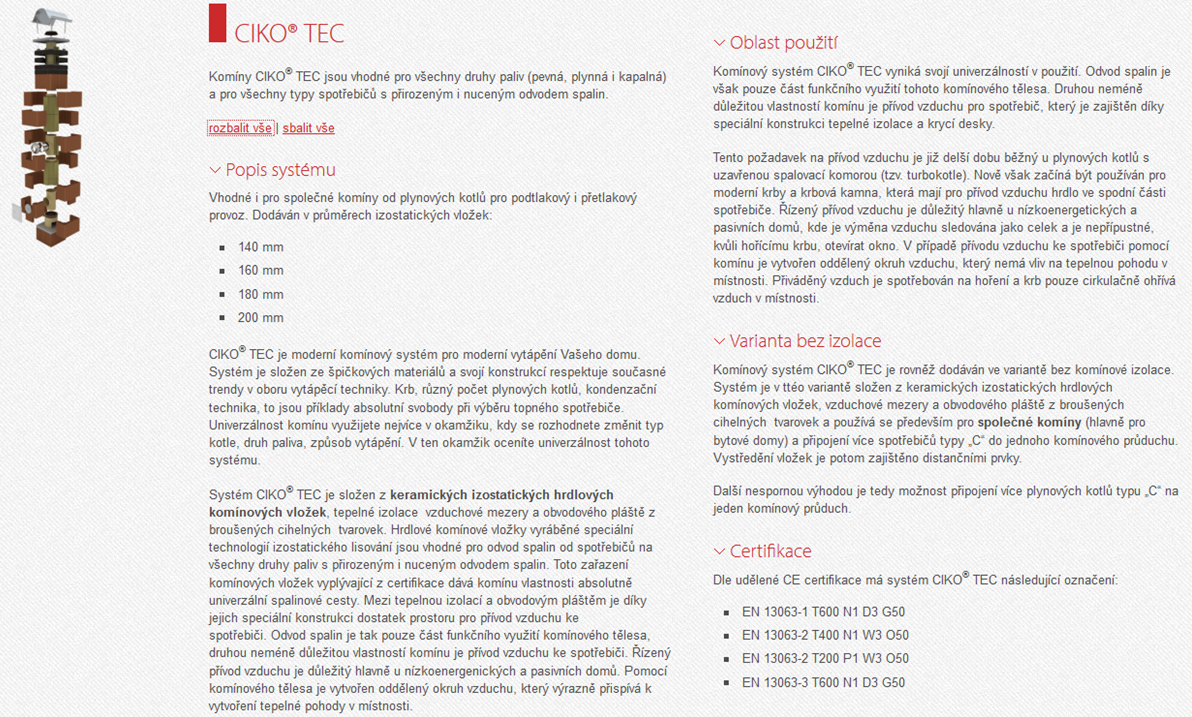 Komínový systém CIKO TEC se skládá z izostatických hrdlových komínových vložek, tepelné izolace a obvodového pláště z broušených cihelných tvarovek. Tento systém je vhodný pro odvod spalin od spotřebičů na všechny druhy paliv s přirozeným i nuceným odvodem spalin. Komín CIKO TEC nejen bezpečně odvádí spaliny od spotřebiče, ale díky svému unikátnímu řešení přivádí vzduch ke spotřebiči v rámci jednoprůduchového komínu. Řízený přívod vzduchu je důležitý hlavně u nízkoenergetických a pasivních domů. V případě přívodu vzduchu ke spotřebiči pomocí komínového tělesa je vytvořen oddělený okruh vzduchu a na hoření tak není spotřebováván ohřátý vzduch z místnosti.