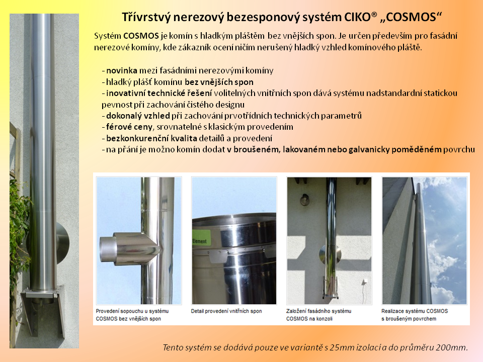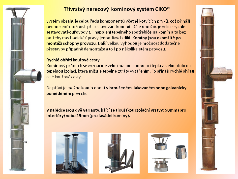 Pod označením TŘÍVRSTVÝ NEREZOVÝ SYSTÉM CIKO najdete certifikované komínové systémy předního německého výrobce Eka GmBH. Tyto výrobky vyhovují všem technickým požadavkům a splní všechna Vaše očekávání z hlediska kvality a designu. Jednou z předností je zvýšená statická pevnost, díky níž je možno tento komínový systém vystavět až do výšky 3 metrů bez kotvení.