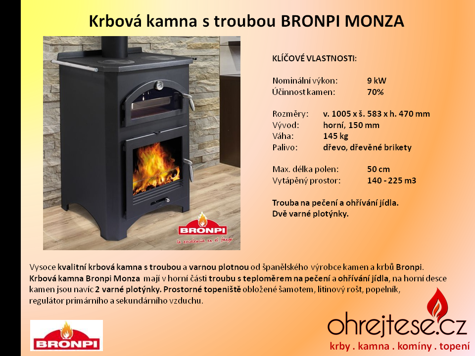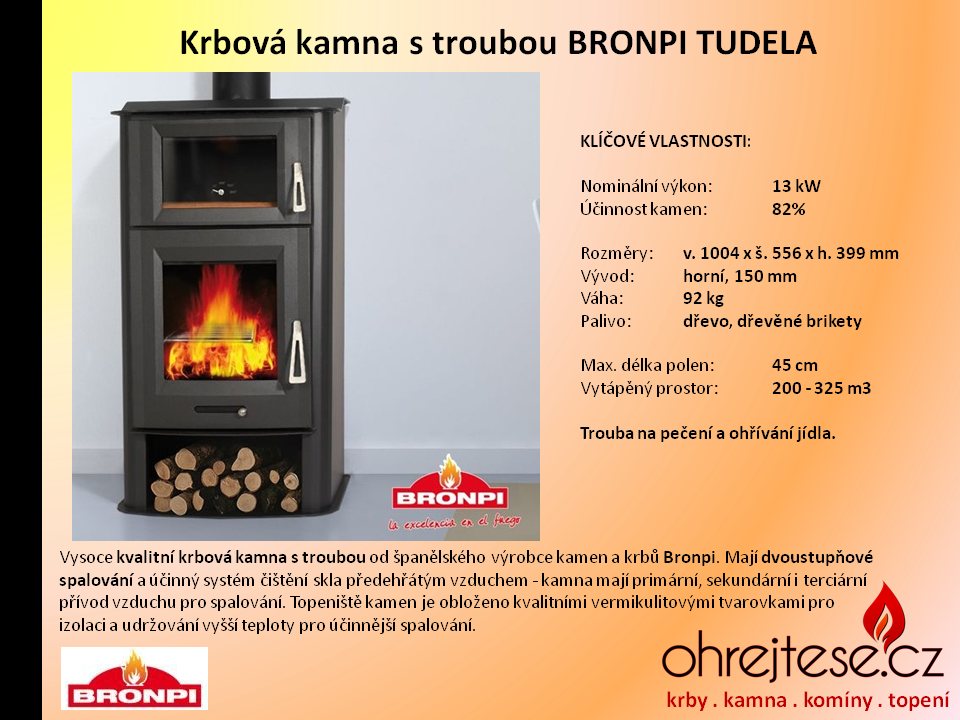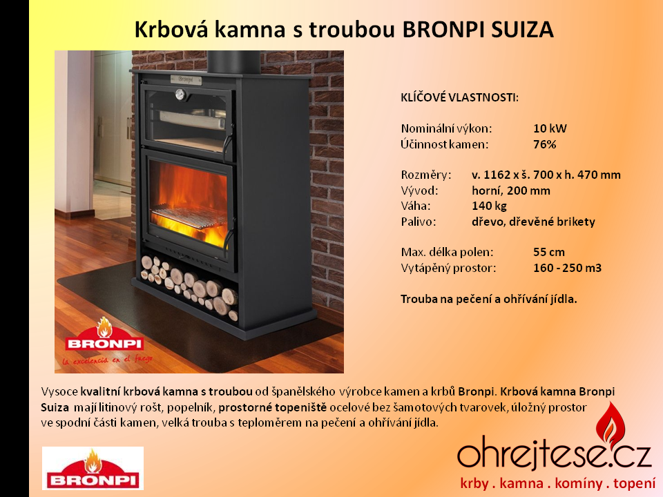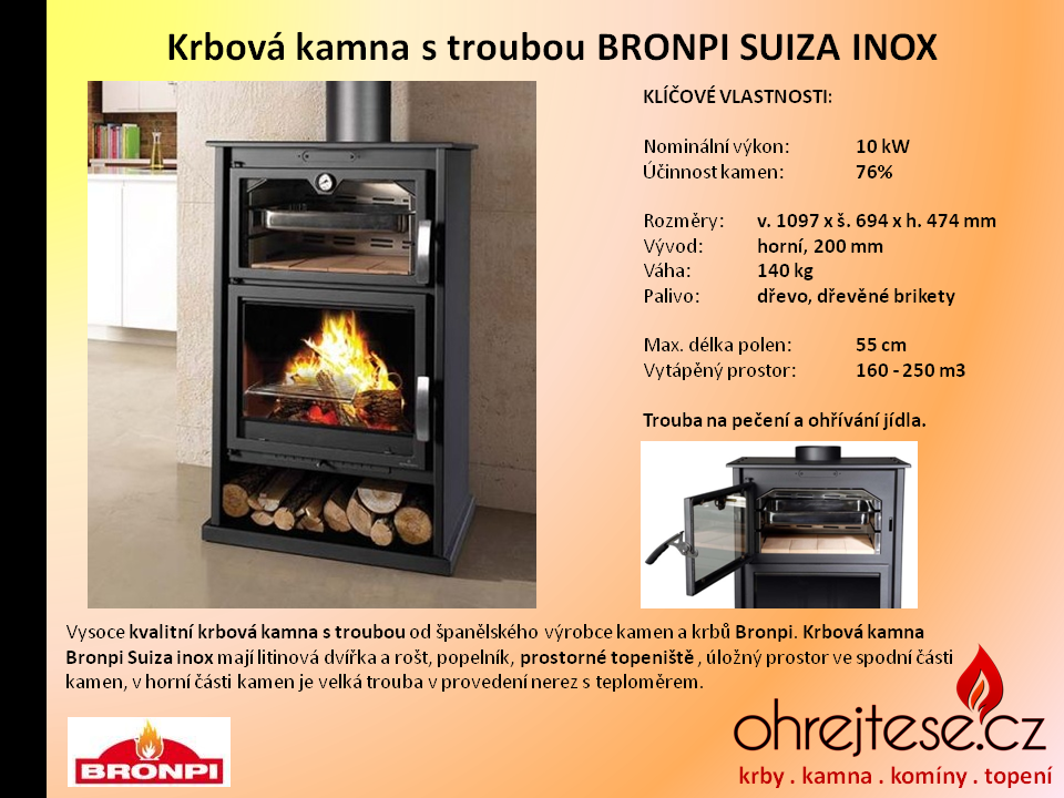 Španělský výrobce kvalitních krbových kamen BRONPI přišel se zajímavou kombinací: Krbová kamna s troubou na pečení a ohřívání jídel. Trouba má ve spodní části speciální akumulační keramickou vyzdívku a je opatřena teploměrem. Některé typy dokonce umožňují používat dva pečicí plechy najednou.