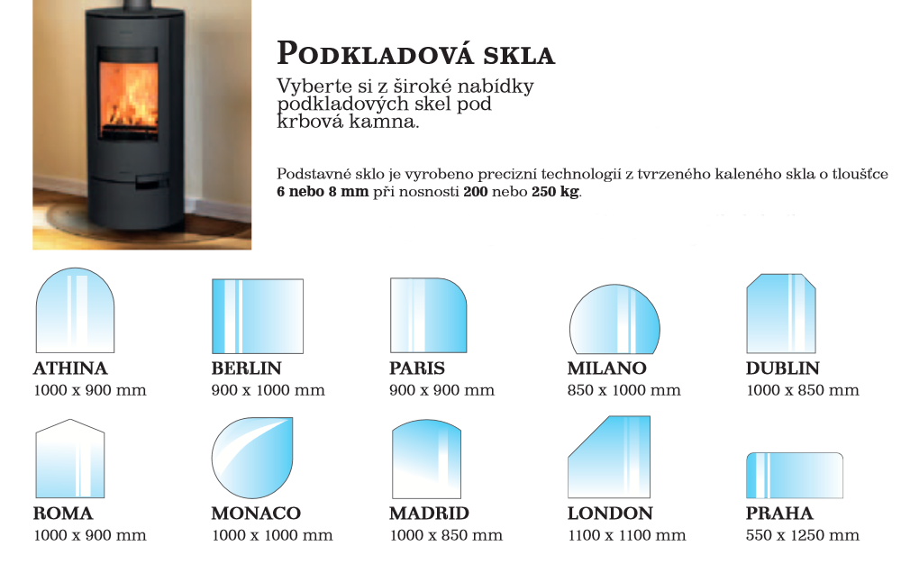 Podkladová skla jsou vyrobena z tvrzeného kaleného skla o tloušťce 6, 8, resp. 10 mm podle toho, jak těžkými kamny budou zatížena. Obvykle se uvádí, že 6 mm sklo je pro váhu do 150 kg, 8 mm do 250, nad tuto váhu kamen je doporučena tloušťka 10 mm. Spolupracujeme rovněž s výrobcem podkladových skel na míru který je schopen vyrobit téměř libovolný tvar - přesně podle Vašich představ. Každé sklo je rovněž možno opatřit fazetou (zkosenou nášlapnou hranou).