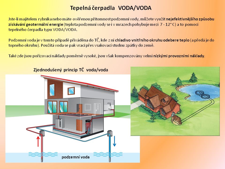 3. Tepelné čerpadlo "voda/voda" - v tomto případě můžete venkovní teplo snímat buď z povrchových vod nebo prostřednictvím hloubkového vrtu. Je jasné, že také toto provedení je mimořádně náročné jak po finanční stránce, tak z pohledu realizace v konkrétních podmínkách. Ne všude je vůbec možné takový vrt zajistit. Musíte vzít v potaz, že na místo se musí dostat vrtná souprava, nad místem vrtu nemohou být elektrické nebo telefonní dráty, koruny stromů, atd.