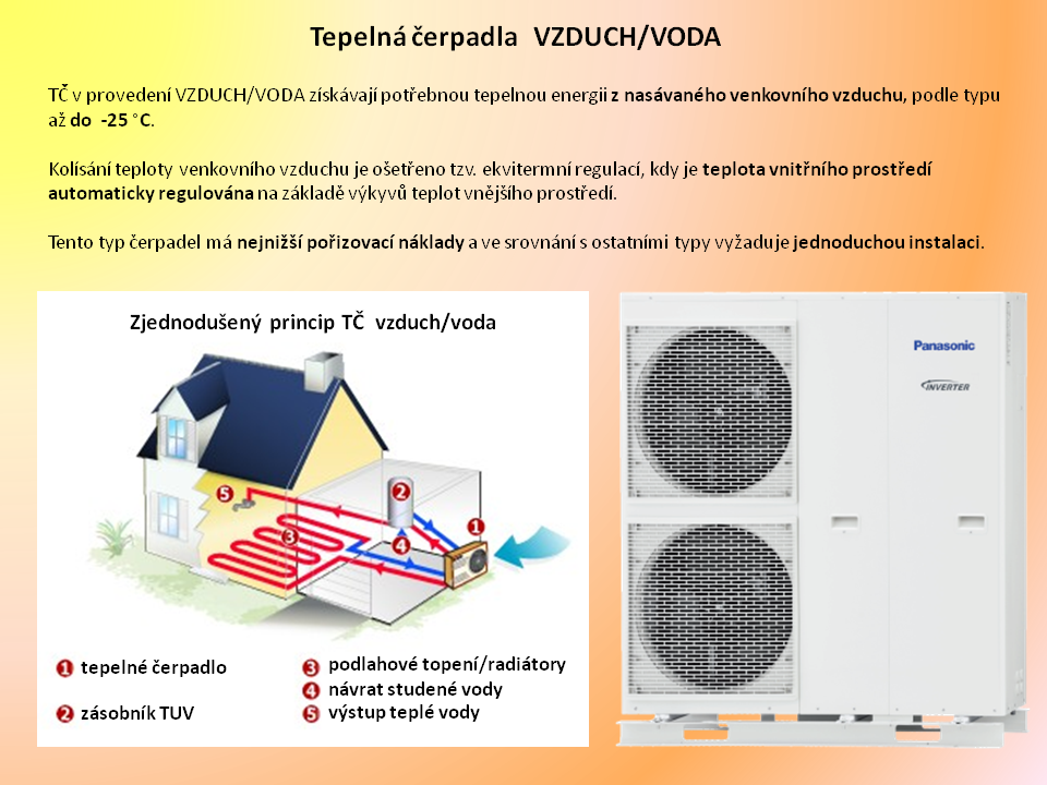 1. Tepelné čerpadlo "vzduch/voda" - nejrozšířenější typ, jeho základní výhodou je, že k jeho pořízení nepotřebujete další navazující investice.