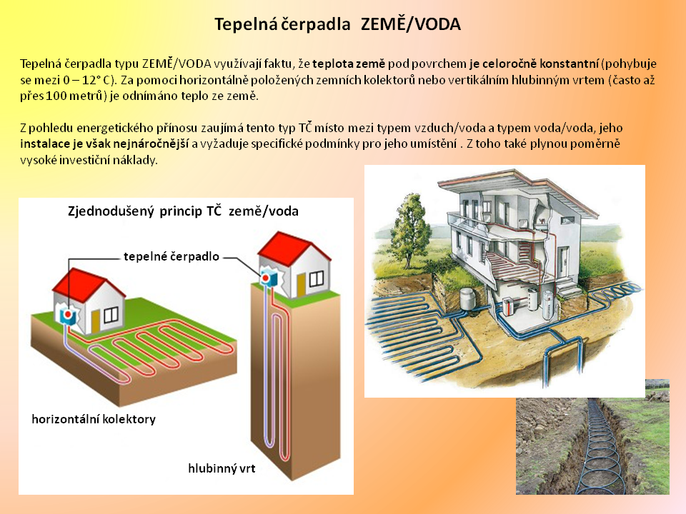 2. Tepelné čerpadlo "země/voda" - nejznámějším provedením je snímání tepla z půdy na Vaší zahradě, což sebou nese nemalé náklady na vybudování kolektoru. K tomu ovšem potřebujete poměrně velkou volnou plochu na vašem pozemku (běžně se uvádí potřeba až 250 m2 bez jakékoli budoucí zástavby (bazén, garáž, atd.)), svoji roli při rozhodování hraje také fakt, že hadice se pokládají do hloubky až 1,2 metru. Pokud máte svůj dům na skále, je pro Vás tento typ čerpadla zapovězen...