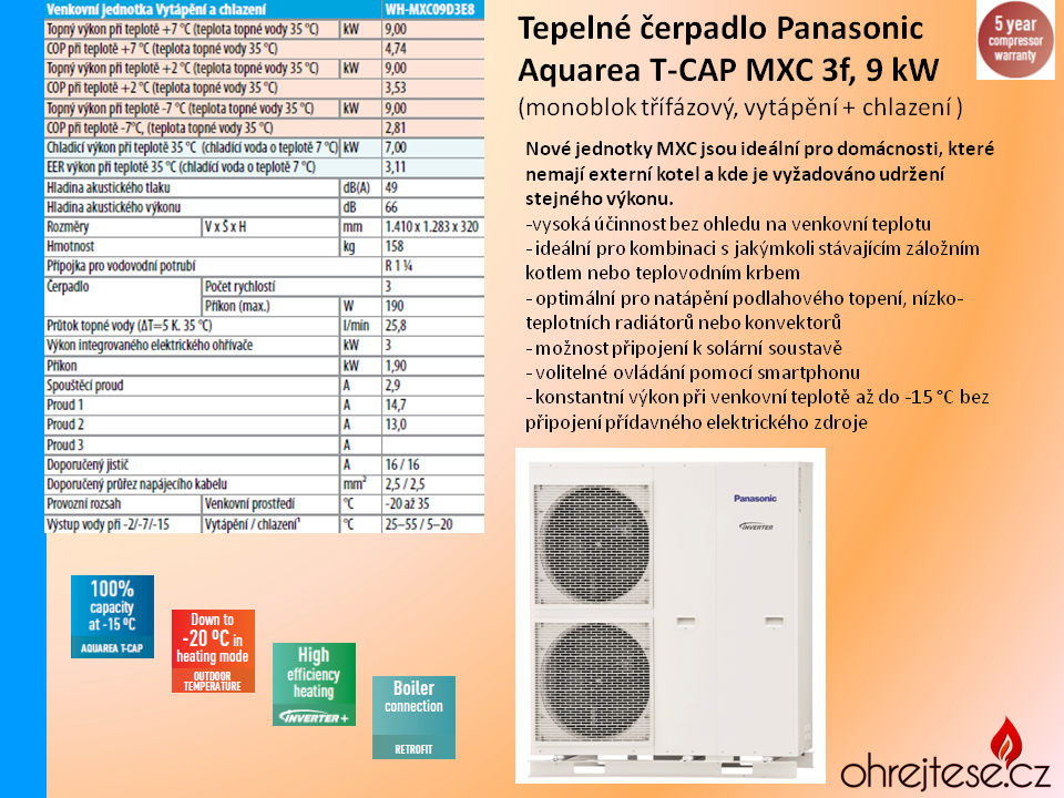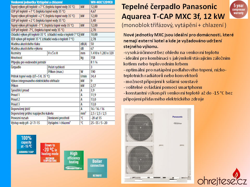 b) Aquarea T-CAP (Total Capacity) - pro možnost efektivního vytápění i při nízkých teplotách až -15o C bez připnutí integrované elektropatrony - často se používá v horských oblastech,